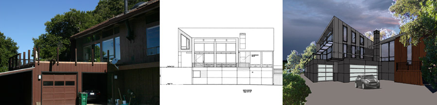 We've been thinking about this project since we bought the house in 1995. The basic idea: knock down the flat-roof 2-car garage and replace it with a 3-car garage, with a great room above, and a stair entry from the garage level to the main level. As well, we wanted to do some structural/earthquake retrofits at the same time. In the late 90's, we worked briefly with a home designer, with no luck. We got serious in early 2005 and hired Fuse Architects of Capitola to design our dream remodel. As we neared finalizing the design in December, 2006, we expanded the project scope to remodel the master suite. Swapping the locations of the bathroom and bedroom, and expanding the bedroom out over the back deck, would take better advantage of the space and the view. We hired a general contractor, and construction started June 18, 2007. How long will it take? Two weeks, of course! We expect to be closed in to the elements by October, and completion should be sometime in early February, 2008. (Note - 1/30/2008 - not likely! Still not closed in, and done? Try June!) (Maybe September?) Find out more by following the links on the right to view the various phases of design and construction. We recommend using Firefox to get the most out of this site.