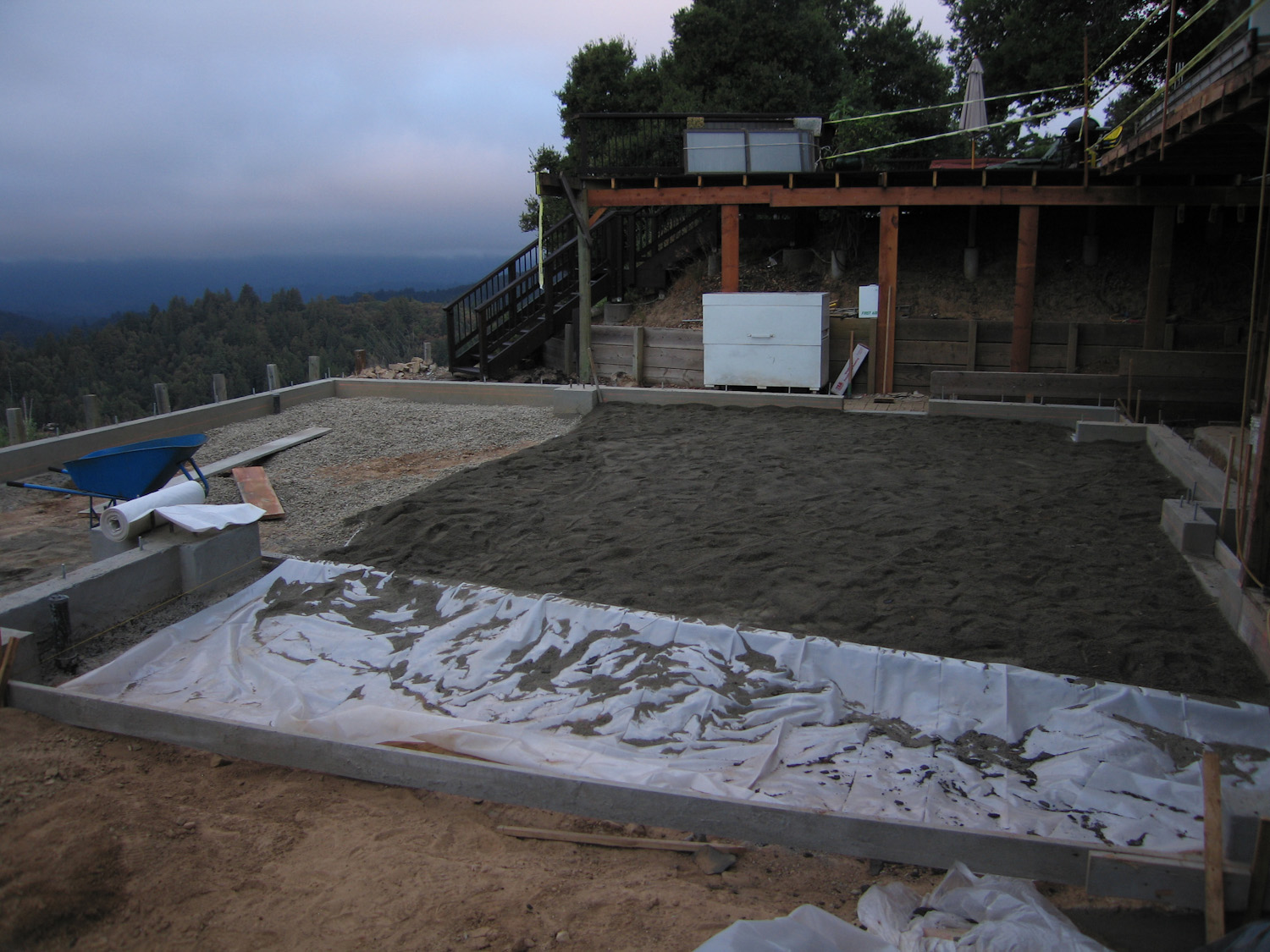 Tuesday 8/7 was a foggy morning. At dawn, a good view of the slab prep from Monday. The two-car part of the garage is up to level - base rock, plastic, and sand. Here you can see the different layers. The division between the two garage areas isn't filled; the slab will rest on the grade beam here.