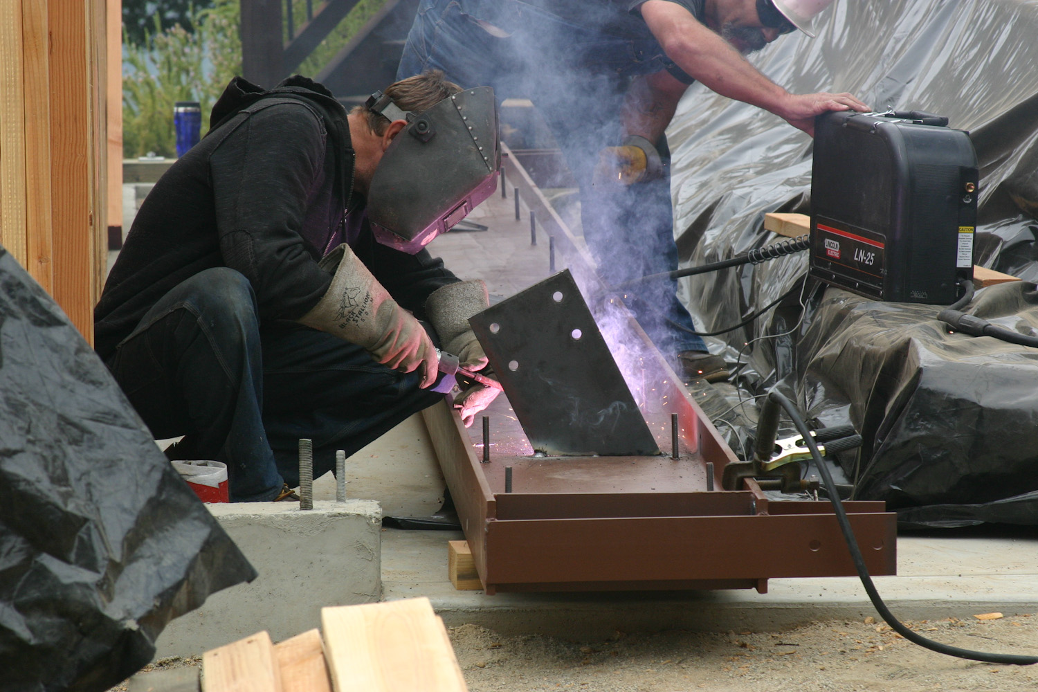 Weldmaster Clay starts to weld the knives the transition beam. You can see the beam has caps for the 6x6 posts, one on each end, and dozens of pre-attached bolts to catch various pieces of wood.