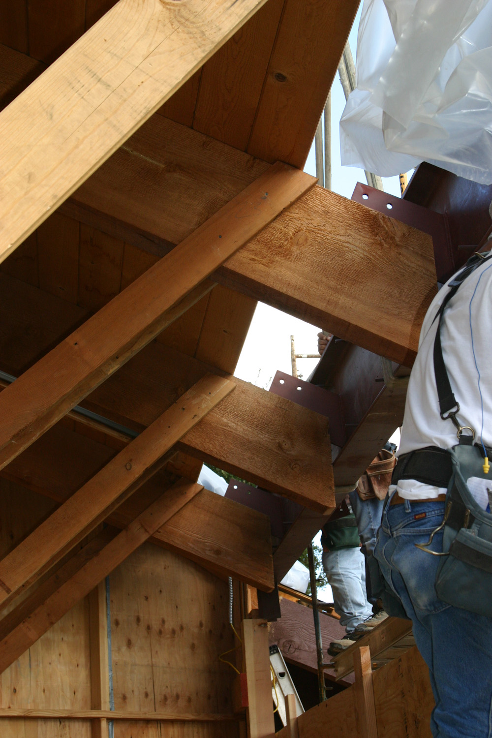 Here you can see the three knives just above the slots in the existing rafters. Keep in mind that these rafters are 30 years old and not all perfectly on center. Each knife is welded specifically for the rafter locations.