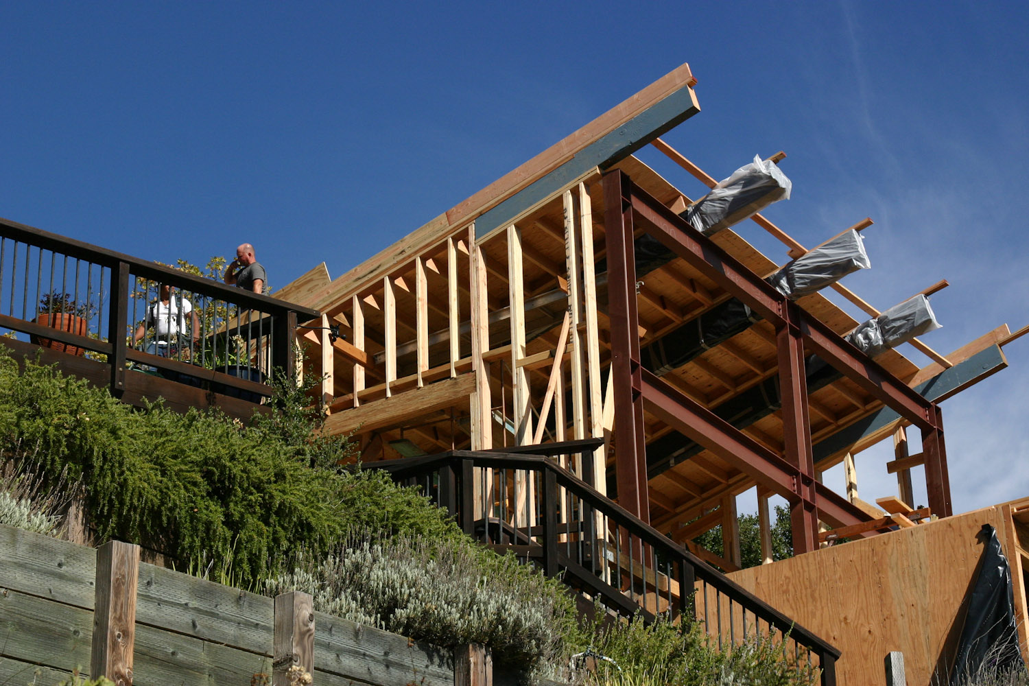 Done with the plywood (up to the overhang). Don't worry about the plastic socks for the rafters. They will be sliced off before too long.