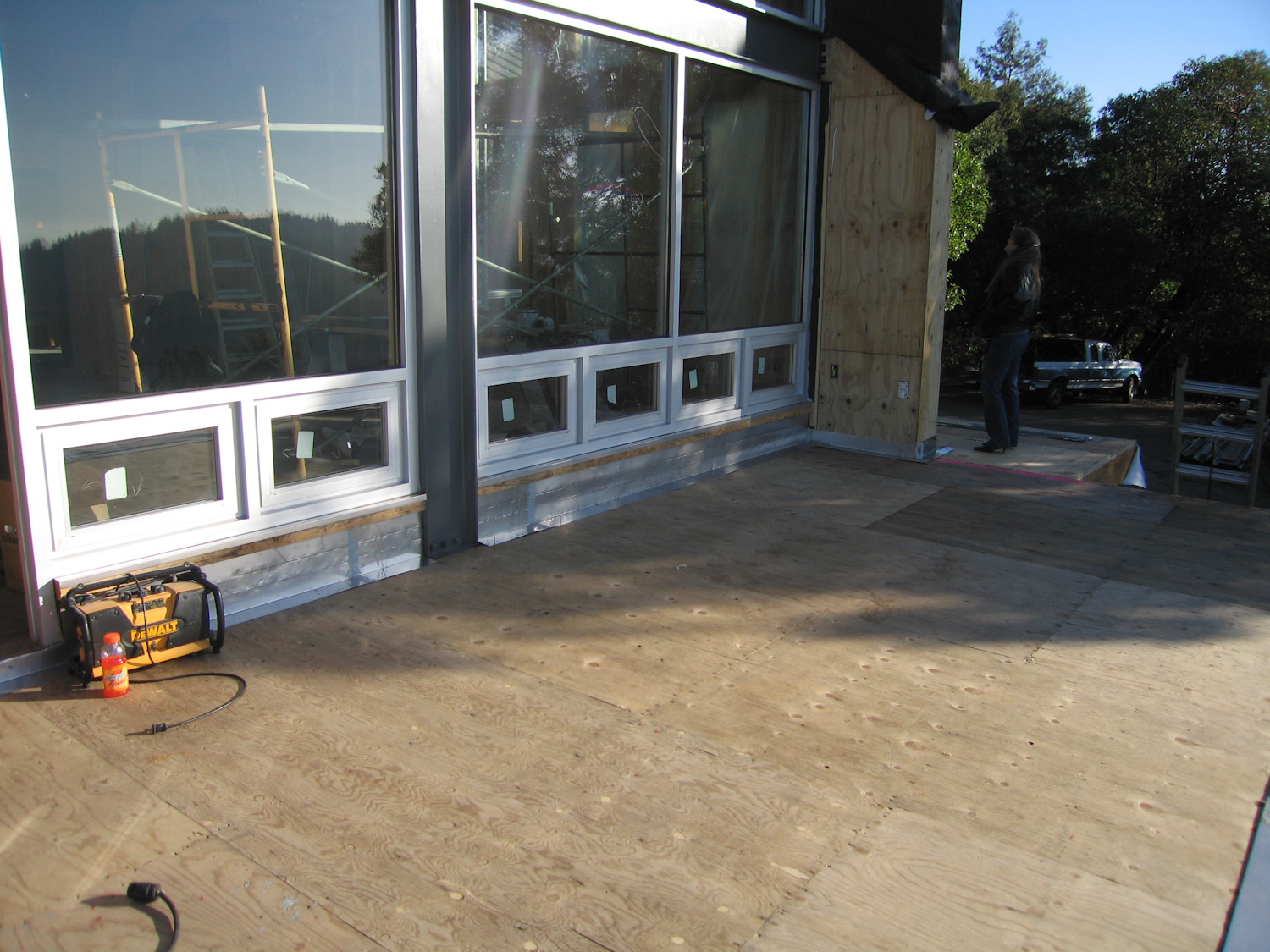 Yes, that flashing looks a little odd. Long story. Short version, we needed to rip up a 2" piece of the floor so we can get tiles to butt up against one another. A "W" flashing was pounded out into the "L" you see here. Don't even ask how or why the W showed up in the first place. Beth inspects the front deck in the background.