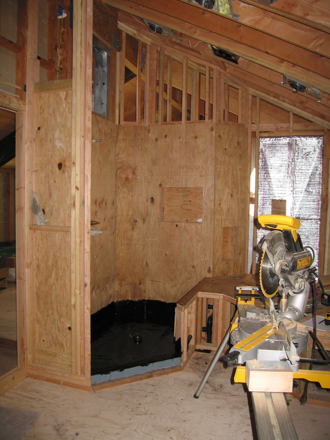 The shower is mopped. It's also boxed in for tiling. This is good progress.